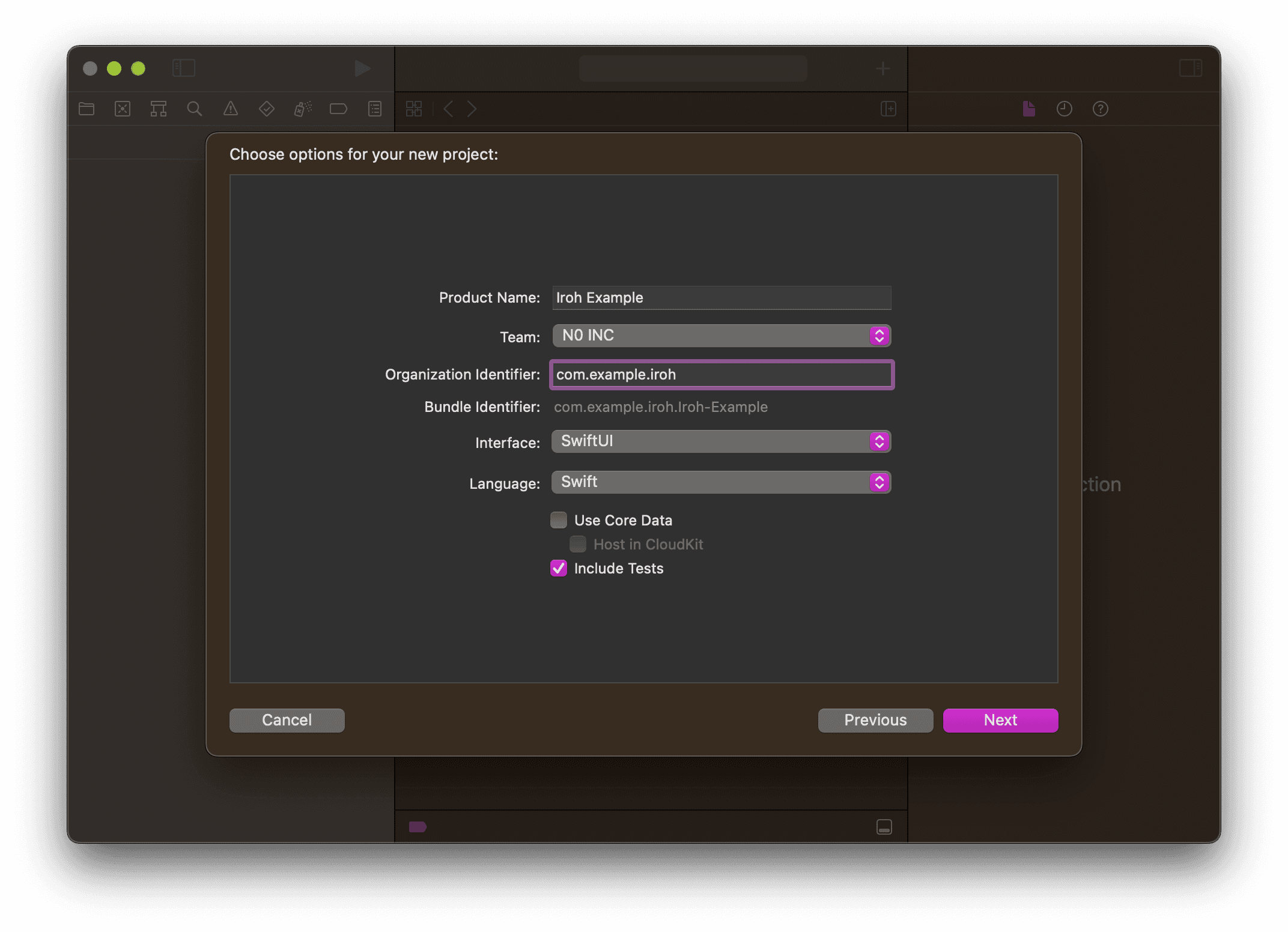 Next, create a new Xcode project. Select "App" under "iOS" and click "Next". You'll need to fill in a few details for your example project. Given this is a starter project, we'll call it "Iroh Example" and set the organization identifier to "com.example.iroh". You can leave the rest of the fields as their defaults.