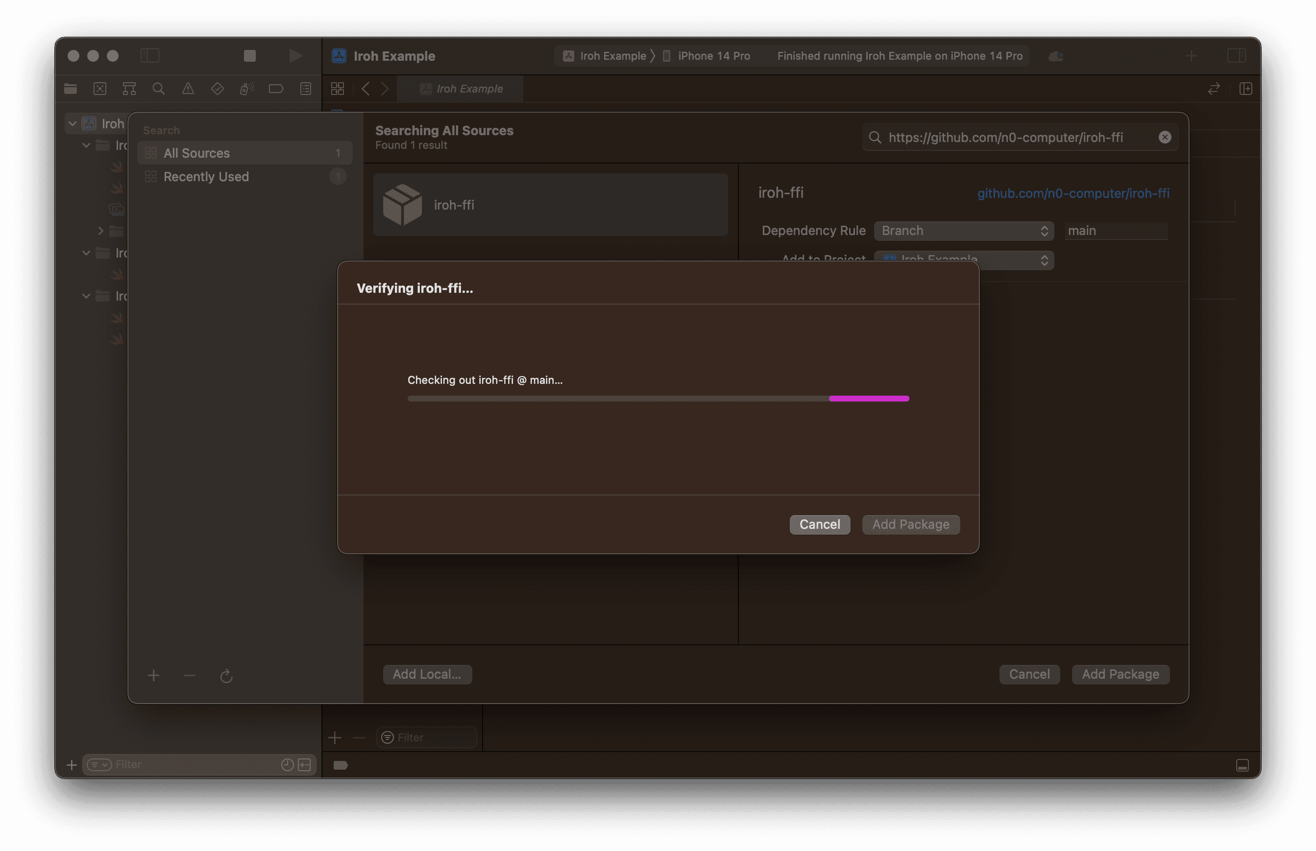 Resolving the package will take at least a minute. Once it's done, you'll see a list of targets to import. Select the IrohLib target and click "Finish".