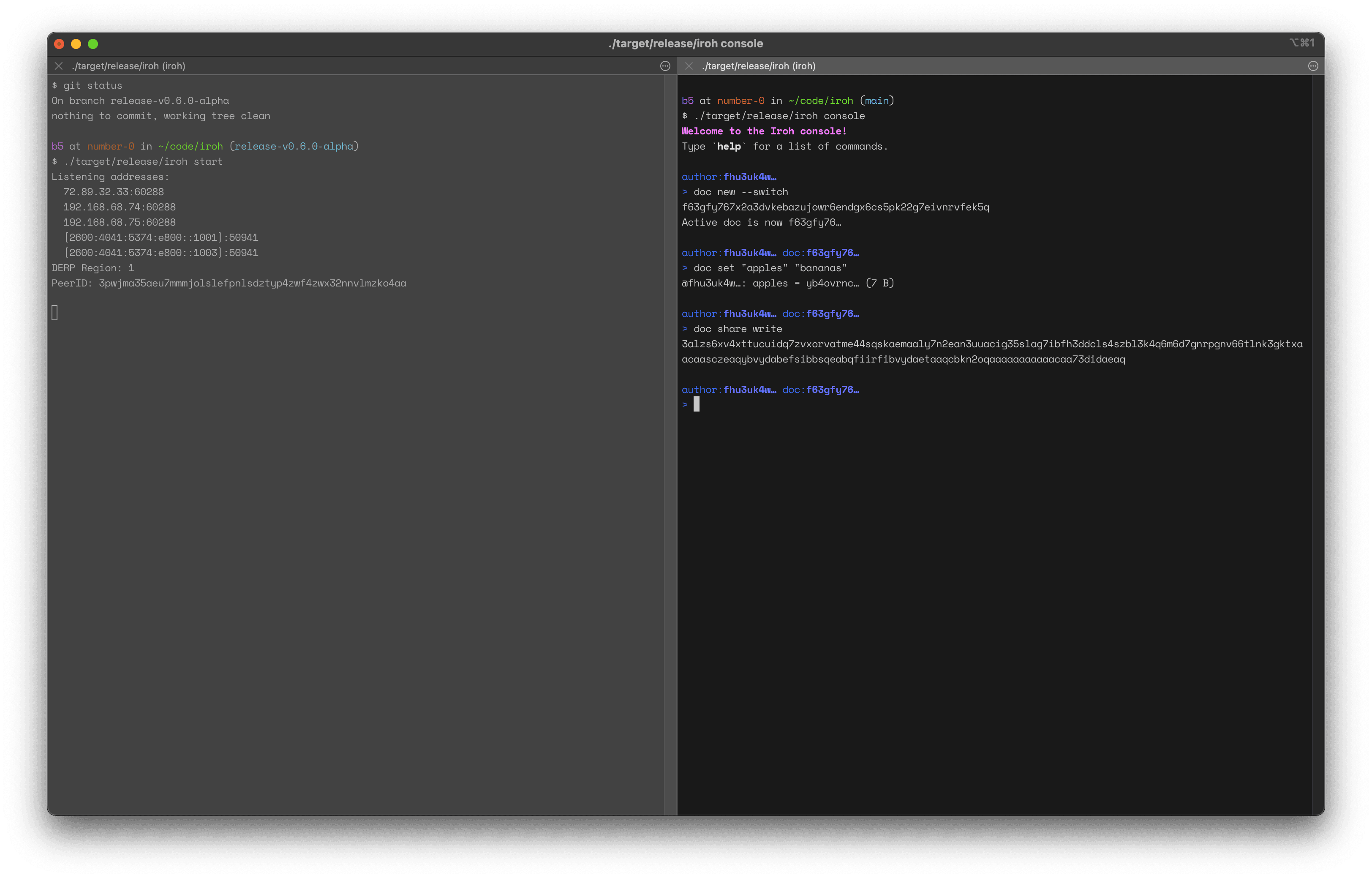 To create a document, we'll use the iroh console. If you haven't already, install the console. Once it's installed, run iroh start in one terminal, and iroh console in another. You should see a prompt like this: