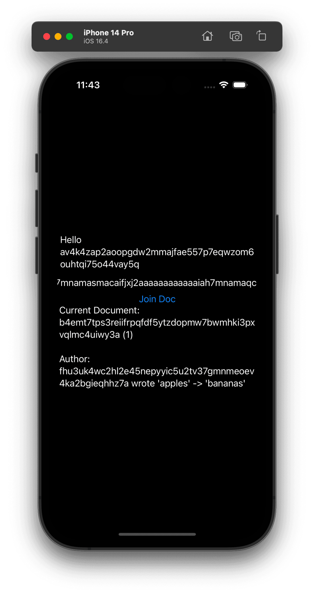 Now that we have a document, we can join it from the app. Run the app in the simulator by clicking the play button in the top left corner of Xcode. Once you do, paste the ticket from the console into the text field and click "Join Doc". You should see the document's contents appear in the text box below:
